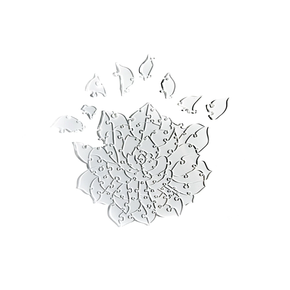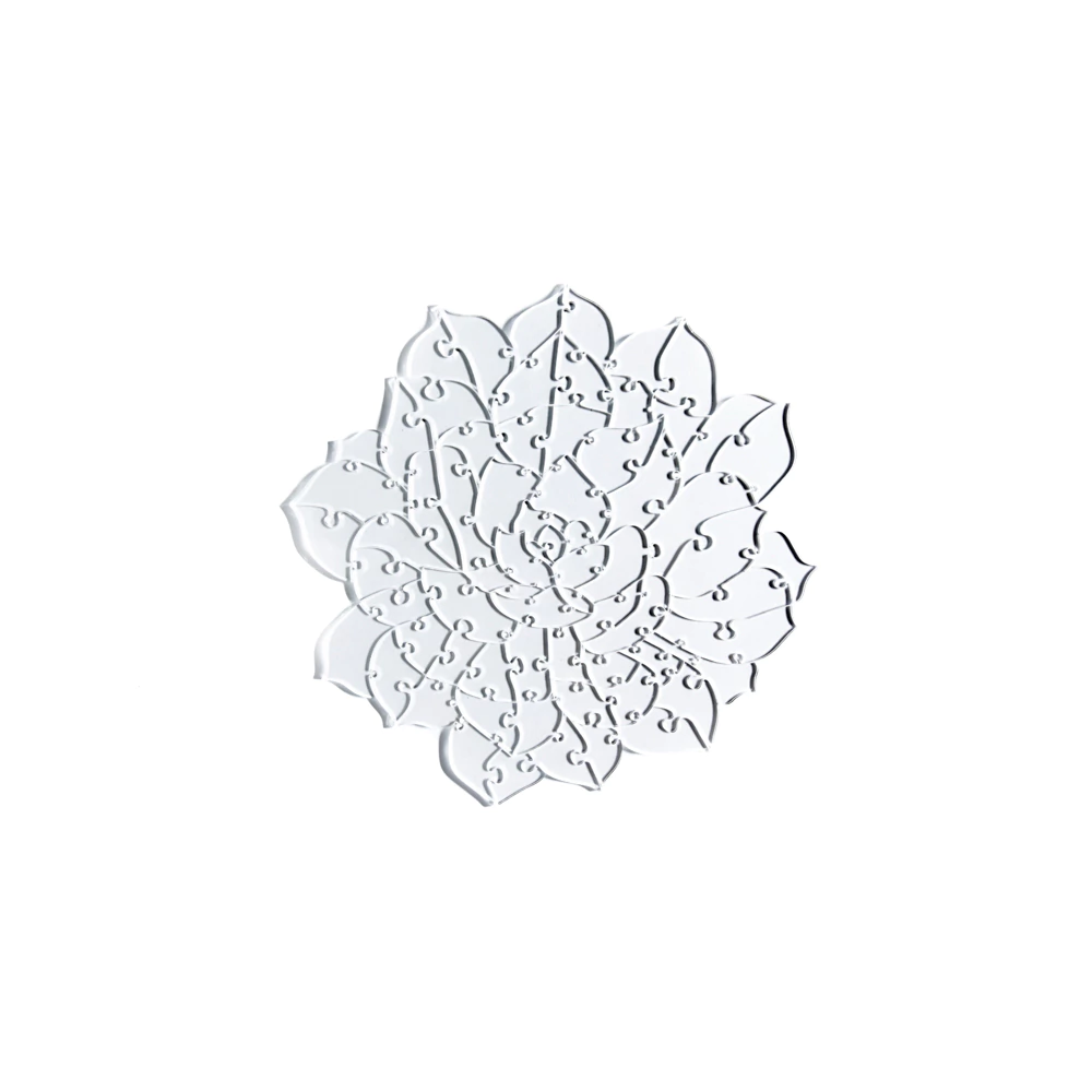 O quebra-cabeça transparente da linha botânica tem peças e encaixes especiais, desenhados à mão, pra criar imagens de folhas e flores.